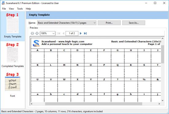 The premium edition includes a template editor that lets you define your own templates so you can decide which characters will be included in your fonts.