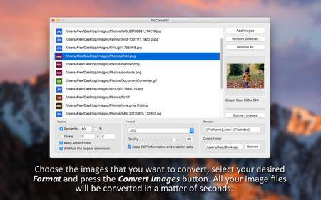 Select the images that you want to convert, choose an image format, select the folder where you want your converted images to be saved and you're done! Your images will be converted in a matter of seconds. Easy and effective. You can also resize your images to reduce their size on disk and optimise them for a specific usage like sending via email or posting on Facebook. Also, if your original image files are poorly named, you can use PicConvert to give them meaningful names so they are easier to find and identify.